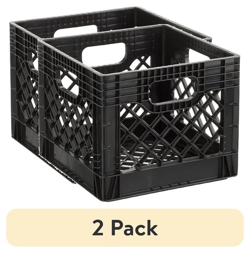 (2 Pack) 16QT Heavy-Duty Plastic Milk Crate Black with Built-In Handles