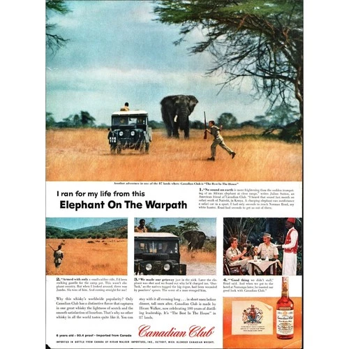 1958 Canadian Club Whiskey Alcohol Vintage Print Ad Elephant African Safari USA