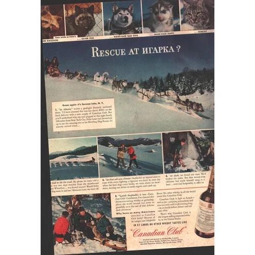 Canadian Club Whiskey Saranac Lake New York WW2 Print Ad 1943 10x13 G4