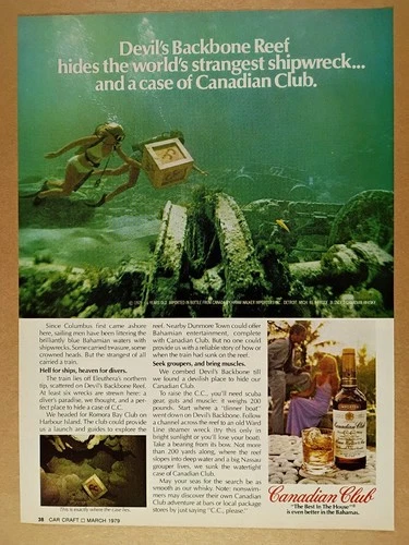 1979 Canadian Club Bahamas Shipwreck Hidden Case divers photo vintage print Ad