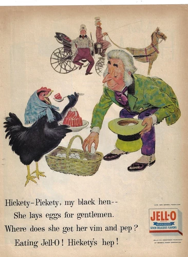 Jell-O gelatin Black Hen lays eggs eats- horse carriage vintage 1955 print ad