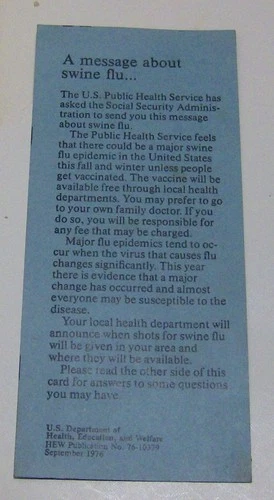 vintage 1976 SWINE FLU US Dept Health MEDICAL BULLETIN card DISEASE pandemic