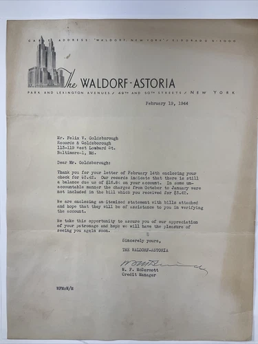 1944 Waldorf-Astoria Hotel New York 79 Year Old Letterhead Bill Collection