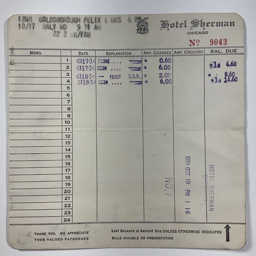 1934 Hotel Sherman Chicago Vintage 89 Year Old Billhead Receipt Bill Head