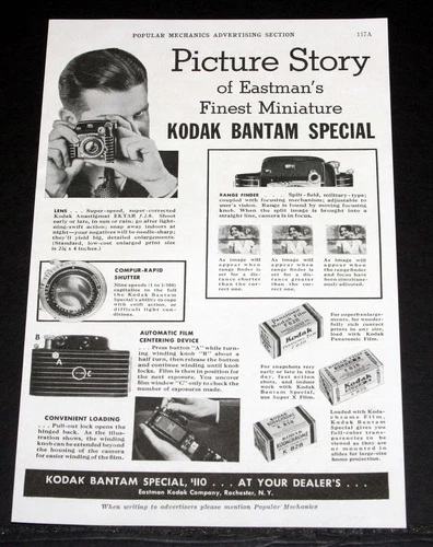 1937 OLD MAGAZINE PRINT AD, EASTMAN KODAK, NEW MINIATURE BANTAM SPECIAL CAMERA!
