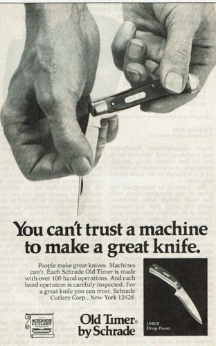 1977 Vintage Print Ad Can't Trust a machine make a great knife Old Timer Schrade