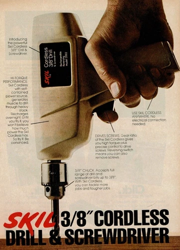 1975 Vintage Print Ad Skil 3/8" Cordless Drill & Screwdriver Drilling into Wood