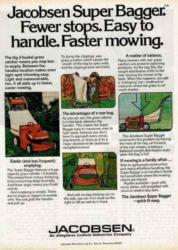 1977 Vintage Print Ad Jacobsen Super Bagger Fewer Stops Lawn Mower Mowing Faster