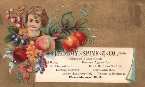 1880s-90s Girl Among Fruit Murray Spink & Co. Jobbers Fancy Goods RI Trade Card