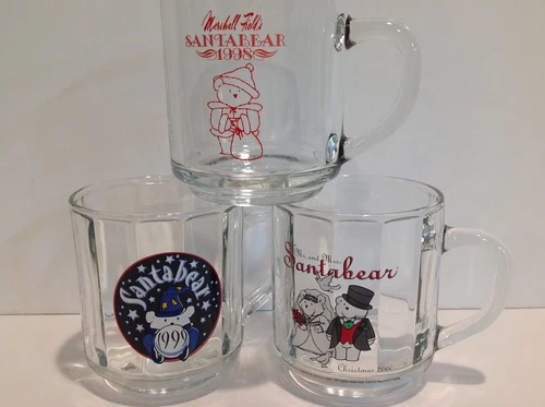 Set of 3 Marshall Field’s Christmas Santabear Glass Mugs 1998 1999 2000