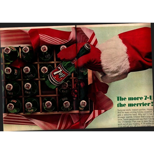 1965 magazine 2 pg ad 7-Up Soda - Santa grabs a bottle from case, Christmas ad