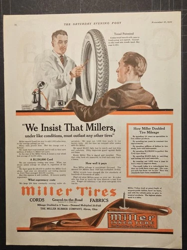 1920 magazine ad for Miller tires, under like conditions outlasts other tires