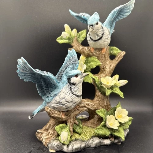 Pair BLUE JAY BIRDS FIGURINE Porcelain Detailed Wings Outstretched 9"x7" Flowers