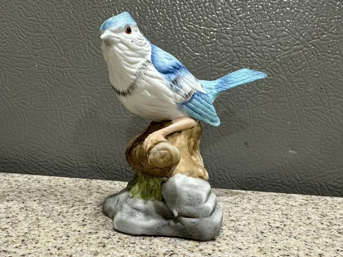 Vintage Enesco Imports 3.25” Ceramic Blue Jay Figurine Sitting On A Stump EUC