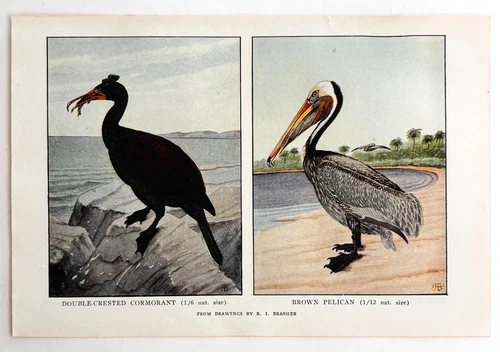 1927 Cormorant And Brown Pelican Bird Art Plate Color Book Print Wildlife F14C