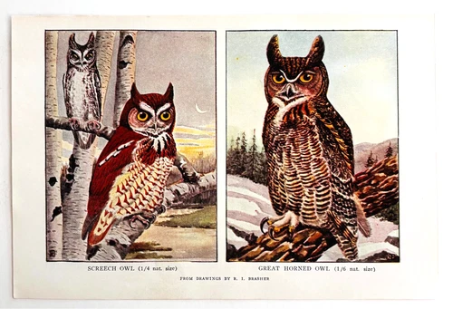 1927 Screech And Great Horned Owls Bird Art Plate Color Book Print Wildlife F14C