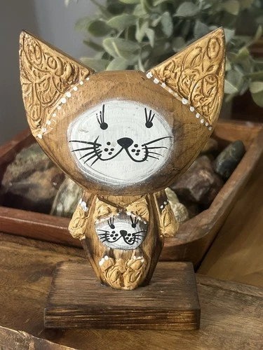 Hand Carved Wooden Folk Art Stripped Fishing Cat Figurine