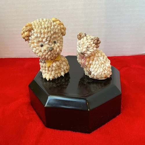 Vintage Folk Art Dog,Cat made From Tiny Seashells Cat Missing Some Shell Minor