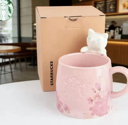 Sakura Season Cat Mug, 355ml Pink Ceramic Cup with Peeking Cat, Collectible