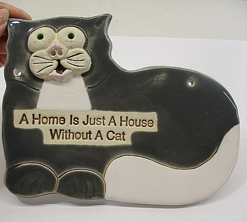 SMOKY MOUNTAIN POTTERY Cat Plaque Sign Wall Hanging Gray White Home Just House