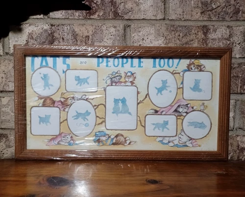 Vintage Cat Collage Wall Frame Wood 9 Photos "Cats Are People Too!" 17.5"x9.5"