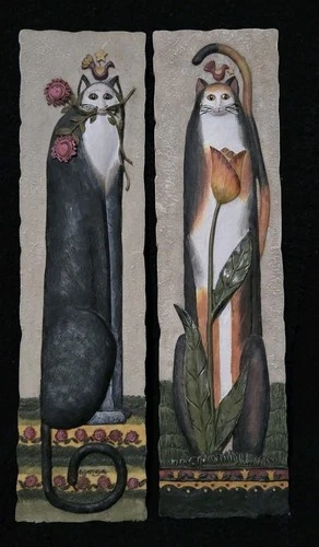 Tall Vintage Pair of Whimsical E. Smithson Cat Wall Art Resin Plaques