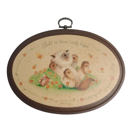 Vintage Hallmark Plaque 1980 Cat & Mouse Fall In Love With Life Wood Wall Art