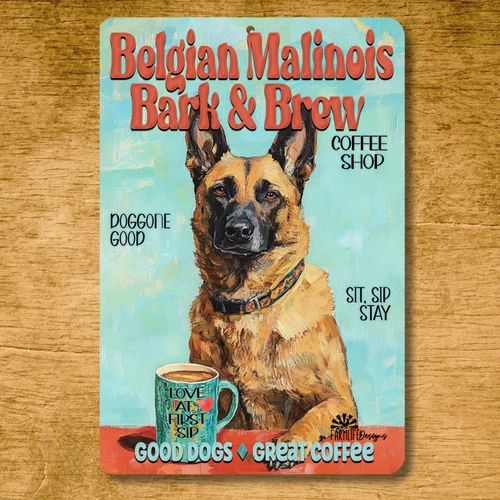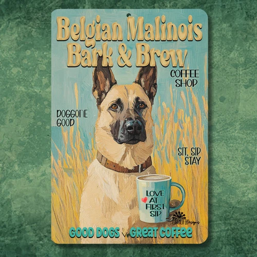 Belgian Malinois Coffee Bar Sign Bark & Brew dog funny metal tin wall art gift