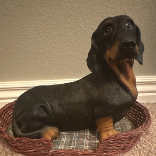 Dachshund Resin Figurine Collectible in Basket Dog Breed Black and Brown