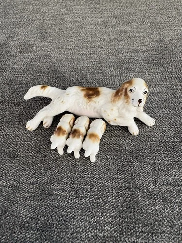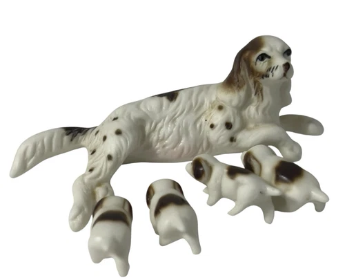 English Springer Spaniel Figurine Set Mother Puppies Vintage Ceramic Miniature