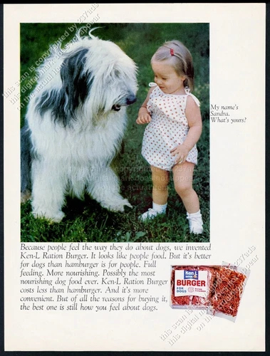 1968 Old English Sheepdog & baby girl photo Ken-L Ration burger vintage print ad