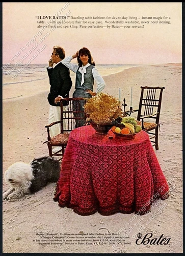 1966 Old English Sheepdog beach photo Bates table fashions vintage print ad