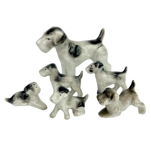 Schnauzer Terrier Figurines Puppies Ceramic Hand Painted 6 Figurines Black White