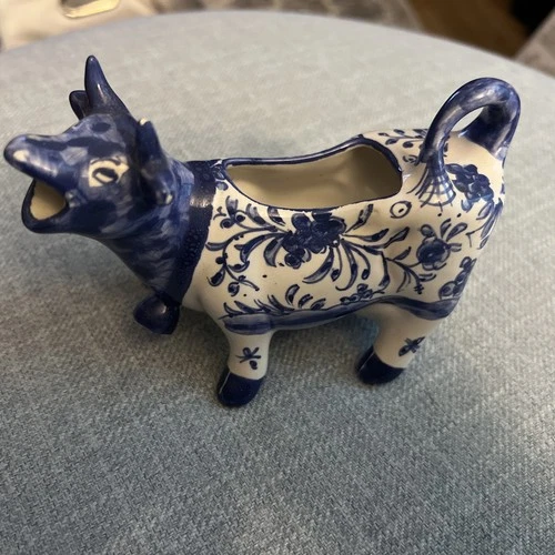 Vintage Delft Blue & White Hand Painted Porcelain Cow Creamer Made In Portugal