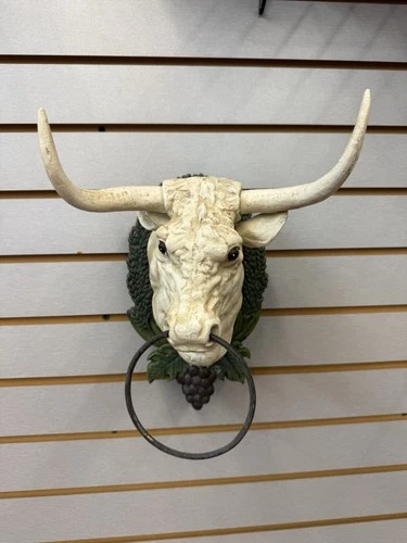 Vintage Cast Iron White Bull Head Country Towel Holder Chippy Western Boho