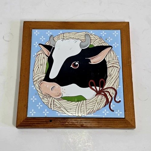 Hanging Wood Framed Holstein Cow Tile Trivet Farmhouse Country Cattle Folk Decor