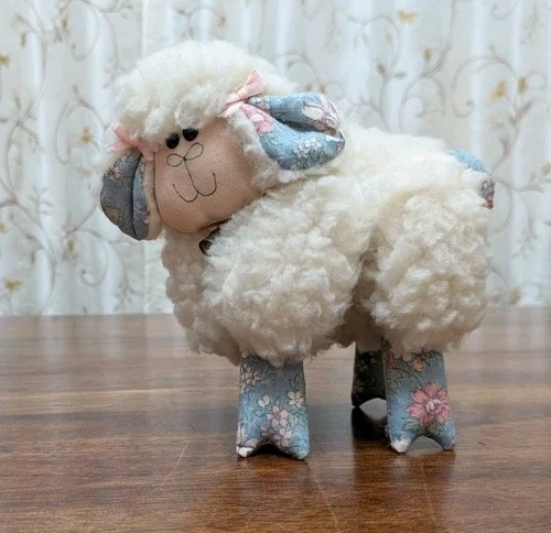 Vintage Primitive Wooly Sheep Folk Art Handmade Bell Pink Bows Floral Fabric