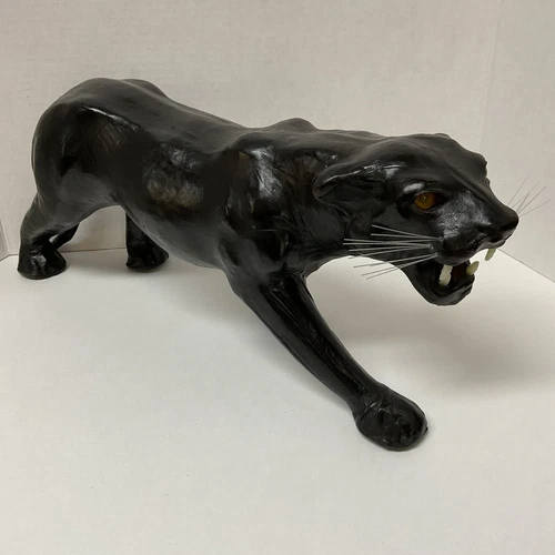 Vintage Leather Wrapped Paper Mache Black Panther Jungle Cat Figure Statue Decor