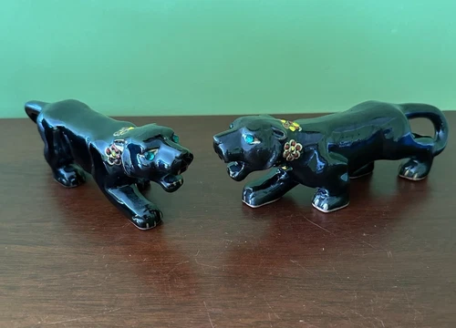 Vtg Stalking Black Panther Figurine Floral Collar Green Eyes Red Ware Set Of 2
