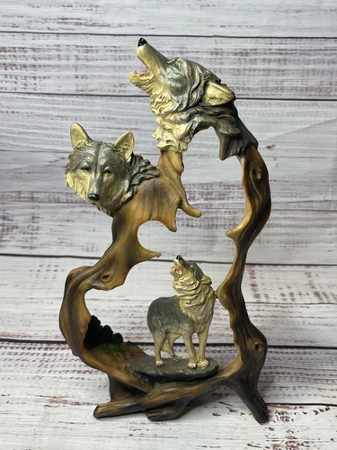 Wolf Pack Head Busts & Figure Scene Howling Faux Carved Wood Woodlike 12 Inch