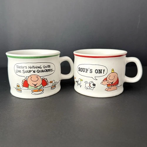 Vintage Ziggy & Fuzz Stoneware Mug “Soup’s On” Cup Tom Wilson 1982 Set of 2 EUC