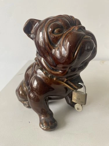 Vintage Locking Bulldog Dog Ceramic Piggy Coin Bank W/ Key Japan