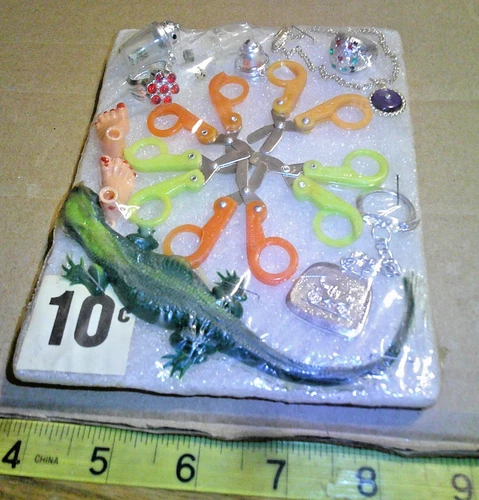 Vintage 10c display card toy mix critters scissors rings charms etc #jd859