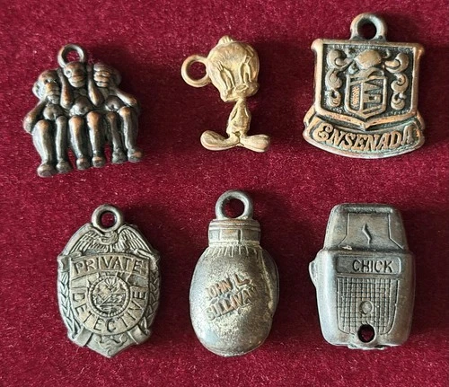 Six Piece Vintage Gumball Cracker Jack Prize "Metal" Novelty Charms ~ Some Rare!