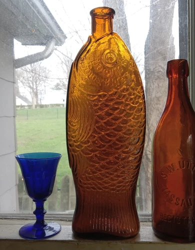 GOLDEN AMBER DOCTOR FISCH'S BITTERS W.H.WARE PAT.1866 FIGURAL FISH BOTTLE MINT
