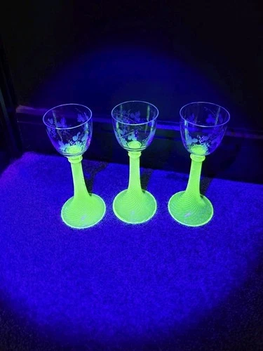 3 Beautiful Uranium Green Glass Wine Glasses Roemer