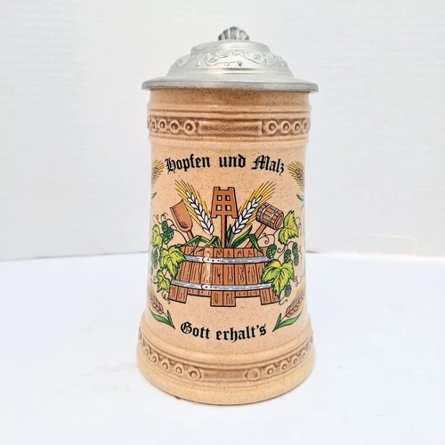 Vintage Hopfen n. Malz Gott erhalt's Lidded Ceramic Beer Stein 7 Inch