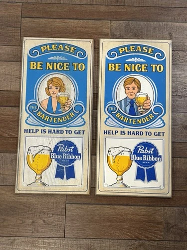 PAIR Vintage Pabst Blue Ribbon Wood Signs “Please Be Nice To The Bartender"