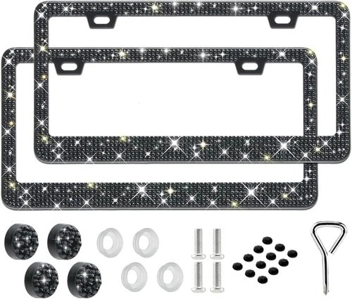 2 Pack Bling License Plate Frame Rhinestone Stainless Steel Black Glitter Caps