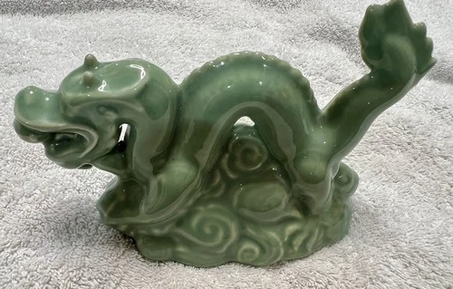 Vintage Celadon Glazed Chinese Dragon Figurine Feng Shui Lucky Symbol 7” Green